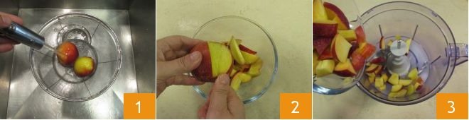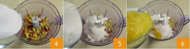 To prepare the peach bread, start by preheating the oven to 356°F, then wash the peaches under running water 1, dry them, and cut them into fairly large pieces 2: you will need 10 oz of peach pulp. Carefully weigh all the ingredients and pour them into the mixer: first, add the peach wedges 3,