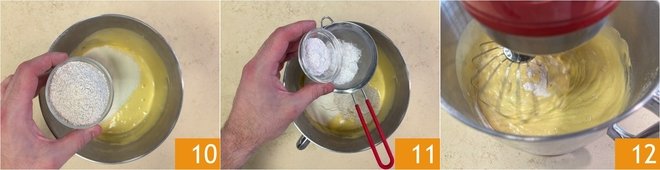 Also add the vegetable oil 7 and continue mixing to combine 8. At this point, sift the all-purpose flour 9.