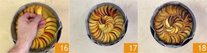 Arrange the peach slices in a circular pattern on the surface of the batter 16, being careful not to place them too tightly together 17. Bake the cake in a preheated static oven at 350°F for 35-40 minutes 17. Once baked, remove the cake from the oven and let it cool 18.