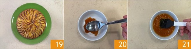 Remove the cake from the pan and transfer it to a serving plate 19. Mix the peach jam with a little water 20 using a brush 21.