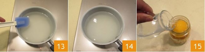Stir with a spatula to completely dissolve the sugar 13, then boil for 2-3 minutes 14. Add the syrup to the peaches in the jars 15 until completely covering the fruits but stopping 1 centimeter from the rim of the jar.