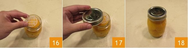 Place a weight on top of the peaches to compress them slightly 16 and ensure there are no air bubbles. Seal the jars by carefully screwing on the lids 17, but without overtightening, and proceed with boiling the jars, or pasteurization, following the guidelines mentioned at the end of the recipe from the Ministry of Health. Once the jars have cooled, check if the vacuum has been created correctly: you can press the center of the lid, and if you don't hear the typical "click-clack," the vacuum has been achieved 18. Your canned peaches are ready to be enjoyed!
