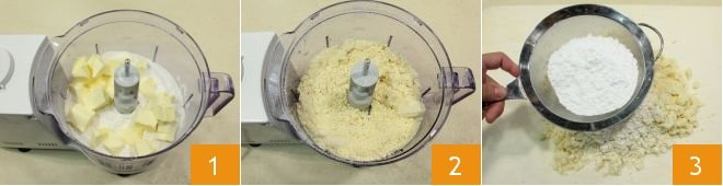 To prepare the pear, amaretti, and chocolate pie, start with the Shortcrust pastry: the ingredients should be cold from the fridge. In a food processor, place the sifted flour, a pinch of salt, and the butter cut into pieces just taken from the fridge 1. Blend everything in pulses to avoid overheating the butter, until you obtain a sandy and floury mixture 2, then pour the obtained mixture onto a work surface (or into a bowl). Add the sifted powdered sugar 3.