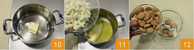 In a saucepan, pour the butter 10 and let it melt over low heat, then add the pears 11 and cook over medium heat for about 3-4 minutes; in the meantime, gather the amaretti in the food processor 12