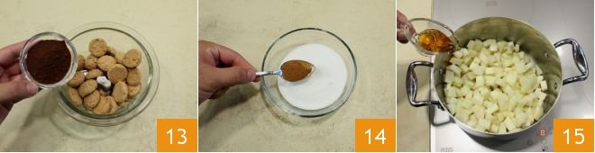 with the cocoa 13; in a separate small bowl, pour the sugar and cinnamon 14; then add the amaretto di Saronno to the pears and let it evaporate 15;