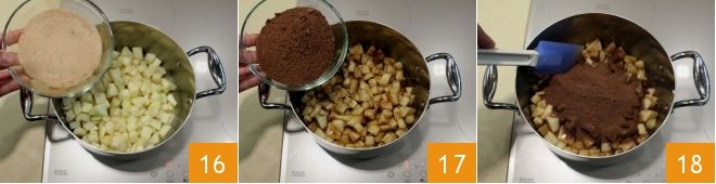 add the cinnamon-flavored sugar to the pears 16 and then the amaretti and cocoa powder 17, mix well with a spoon 18 and cook over moderate heat until the pears have lost their water, about 10 minutes;
