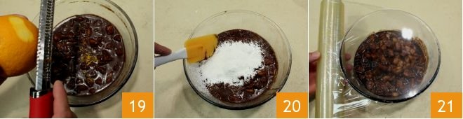 transfer the obtained mixture to a bowl and let it cool slightly, then add the orange zest 19 and the cornstarch 20, then cover with plastic wrap and set aside 21.