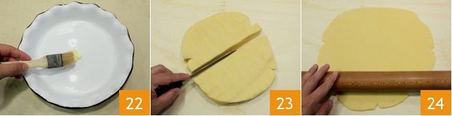 Grease a 8-inch diameter mold on the bottom (and 9 inches on top if using a fluted one) with a pat of butter 22; then take the pastry dough and divide it 23, taking two-thirds for the base and one-third for the top. Roll out the two-thirds of pastry into a disc 1/8 inch thick 24