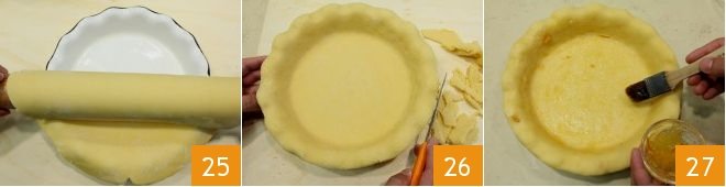 then roll the disc onto the rolling pin, and unroll it onto the mold 25, pressing well into the bottom and sides, then trim the excess pastry (set aside the scraps for decoration) 26; brush the bottom with half the amount of orange marmalade 27.