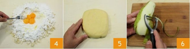 Create a well in the center and pour in the grated lemon zest and yolks 4 (you can also flavor with orange zest, the seeds of a vanilla bean, or cinnamon). Then start mixing everything first with a fork, then when the eggs have absorbed the flour, you can continue by hand, just enough time to compact the dough without overheating it: form a dough ball, flatten it 5, and wrap it in plastic wrap. Then place it in the refrigerator to firm up for at least 30 minutes. In the meantime, peel the Abate pears with a vegetable peeler 6,