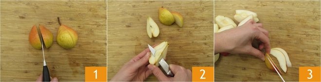 To prepare the pear and cinnamon jam, wash all the pears well. Cut them into wedges 1 and remove the core 2, then slice them thinly, about 0.2 inches 2.