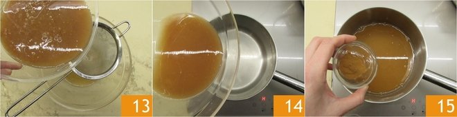 After this time, take the pears from the fridge and strain them to separate the fruit from the juice 13 which you will pour into another saucepan 14. Heat over moderate heat and add the cinnamon 15.
