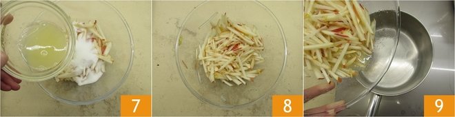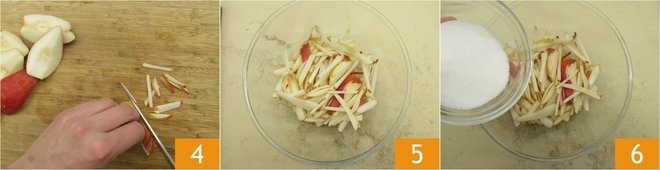 Then cut the slices into julienne strips 4. Transfer the pear sticks into a bowl 4 and add the sugar 5.