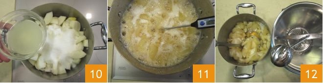 the lemon juice 10 and cook over medium heat. Occasionally move the saucepan to make sure the bottom doesn't stick. Once the sugar has dissolved, raise the heat and, using a thermometer, make sure it reaches 226°F 11 before removing the jam from the heat; once it reaches 226°F, the jam will be ready. Transfer the mixture to a food mill 12