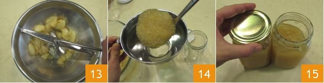 and pass everything through it 13. Use the sanitized jars and fill them with the warm pear and ginger jam 14, then seal them tightly 15. Let the jars cool completely upside down on a clean cloth, until completely cool. Check for a vacuum seal by pressing the center of the screw cap to ensure there is no "click-clack" indicating the seal is not vacuumed.