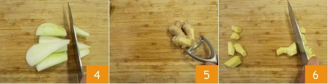 Cut the pears into pieces 4; then peel the fresh ginger root 5 and also cut it into pieces 6. Finally, squeeze the lemon juice.