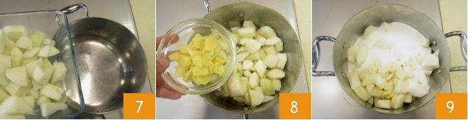 In a large saucepan, place the pears 7, the ginger 8, the sugar 9,