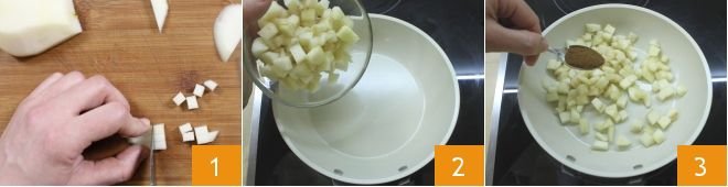 To make the pear blondies, start by peeling the pears and then cut them into cubes of about 1/2 inch 1. Place the pear cubes in a pan 2, flavor with a teaspoon of cinnamon 3, and quickly sauté over high heat.