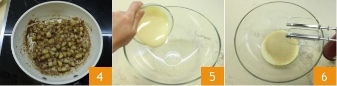 After a few minutes, turn off the heat and let them cool completely 4 and work on the batter: put the condensed milk in a large bowl 5, add the brown sugar and whip the mixture with an electric mixer (or a hand whisk) 6.