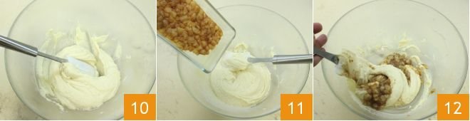until you get a soft and homogeneous mixture 10. Finally, add the cinnamon-flavored pear chunks 11 and mix with a spatula 12.