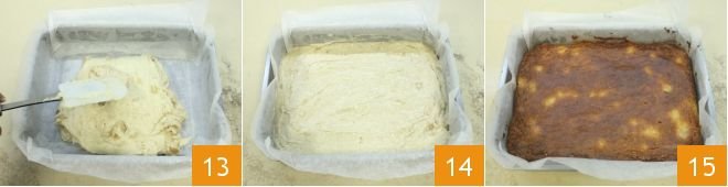 Butter a rectangular baking pan measuring 8x10 inches, line it with parchment paper (for all the details, refer to the guide: How to line a cake tin with parchment paper). Pour the batter into the pan and spread it well with a spatula (13-14). Bake in a preheated static oven at 350°F for about 40 minutes (if using a convection oven, 320°F for 30 minutes) until the surface is golden brown 15. Let the dessert cool,