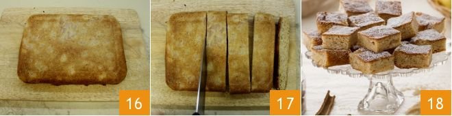 flip it onto a cutting board 16 and cut it into strips 17 and then into cubes. Your pear blondies are ready to be enjoyed; if desired, you can sprinkle them with powdered sugar 18!