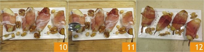Add the honey 7 and cook over low heat, stirring constantly. When the honey has completely melted, remove from the heat and set aside 8. At this point, wrap a slice of Speck around each pear wedge 9.
