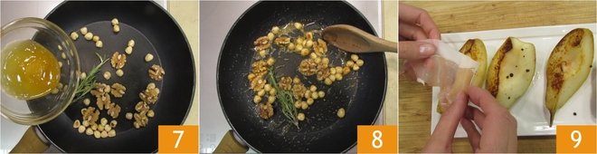 Once golden, turn off the heat and set the pears aside, keeping them warm 4. Put the mixed dried fruit and nuts in another pan 5 and add the rosemary 6.