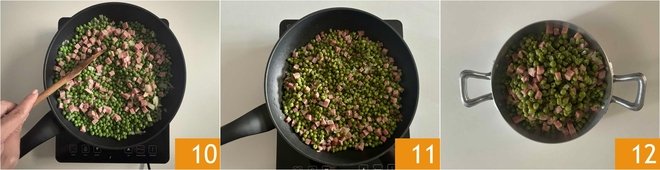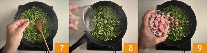 Fragrance with fresh basil 7, pour about 3.5 tablespoons of water 8 and set aside the rest: add it only if necessary. Cook the peas on a low flame, stirring occasionally for about 10-15 minutes. When about 5 minutes are left, add the cooked ham previously cut into cubes 9.