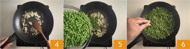 When the onion is soft 4, add the peas 5 and adjust with salt 6.