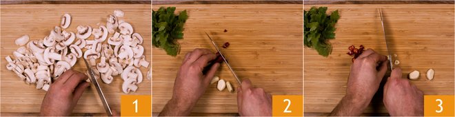To prepare the penne all'arrabbiata with champignon mushrooms, the first thing you should do is slice them 1. Cut the chili pepper into pieces 2, peel the garlic and slice it 3.