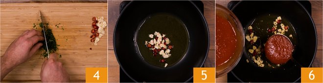Finally, also chop the parsley 4. Heat a generous amount of extra virgin olive oil in a rather large pan, and add garlic and chili pepper. Sauté everything over moderate heat, being careful not to burn the garlic 5. Add the tomato puree 6 and let the sauce cook over moderate heat.