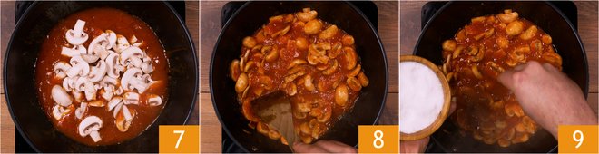 Then, also add the previously sliced mushrooms 7 and let the sauce cook for about 10-15 minutes, until it is thick enough 8. In the meantime, put a pot full of salted water on the stove, which will be used for cooking the pasta. Once ready, salt the mushroom sauce 9.