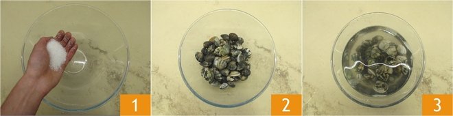 To make the Penne on a Boat, first, take care of cleaning the clams: make sure there are no broken or empty shells, as they should be discarded. Then proceed to tap them against the sink or on a cutting board. This operation is important to check that there's no sand inside: healthy bivalves will remain closed, while sandy ones will open. Let the clams purge: in a large bowl, pour coarse salt 1 and the clams 2, cover with water 3 and let them soak for a couple of hours.