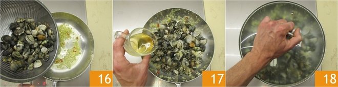 Add the clams 16, deglaze with white wine 17, and cover with a lid 18. Cook until all the shells are open. Meanwhile, place a pot filled with salted water on the stove and bring it to a boil.
