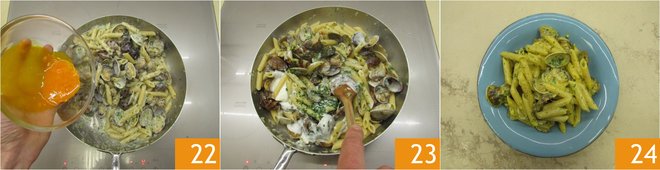 Cook the pasta 19 and drain it 3-4 minutes before the end of the cooking time directly into the pan with the clams 20. Finish cooking in the pan for 4-5 minutes; the pasta should absorb almost all the juice released by the clams and start to have the right creaminess. With the heat off, with the pan still very hot, add the béchamel sauce 21.