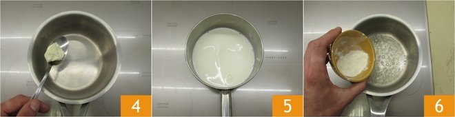 In the meantime, prepare the béchamel sauce. Melt the butter in a saucepan 4, and in another, heat the milk 5 and add a pinch of salt. Once the butter has melted, add the flour all at once 6 and stir with a whisk.