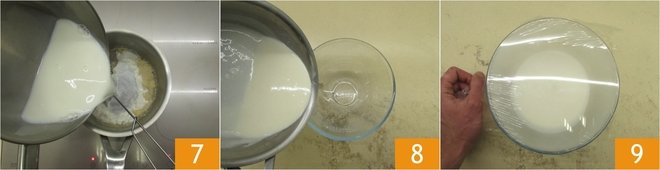 Once the roux is obtained, add the milk 7 and cook for a few minutes, stirring constantly, until you achieve a smooth and homogeneous consistency 8. Keep the béchamel sauce at room temperature covered with plastic wrap 9.