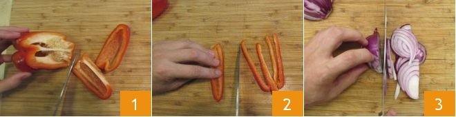 To prepare peperonata, wash and dry the peppers. Then slice them lengthwise, all around the core 1, remove the white filaments and reduce them to thin layers 2. Peel and slice the onions 3.