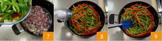 pour in the peppers 7. Add salt 8 and pepper, then stir 9