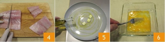 then coat one piece of perch at a time, on both sides, first in the egg 7, then in the flour, ensuring it adheres well over the entire surface 8. Once the oil and butter begin to sizzle gently, add the floured fillets to the pan 9