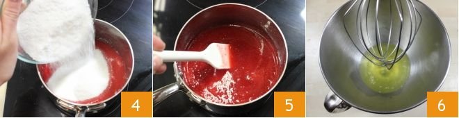 In a small saucepan, combine the fruit juice and 3.5 oz of sugar 4, stir with a spoon 5 checking the temperature with a kitchen thermometer. In the meantime, when the syrup reaches 239°F, whip the egg whites in a planetary mixer 6,