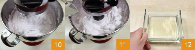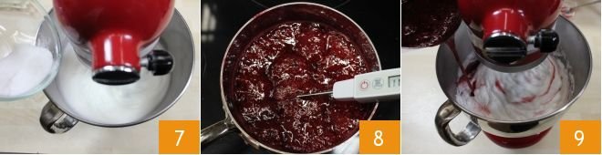 when they are semi-whipped, add 0.9 oz of sugar 7 and continue to whip until stiff. At this point, once the syrup has reached 250°F 8, remove it from the heat and pour it slowly over the whipped egg whites 9
