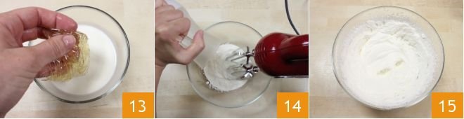 and dissolve it in 1.7 oz of warm cream 13. Whip the remaining 8.5 oz of cream (14 -15) (for more details on this process consult the guide How to Whip Cream from our cooking school).