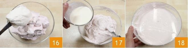 gently fold the whipped cream into the meringue 16, stirring from bottom to top, so that it does not deflate, finally pour in the cream in which you have dissolved the gelatin 17 and mix well, cover with plastic wrap 18 and place in the refrigerator to set for at least a couple of hours.