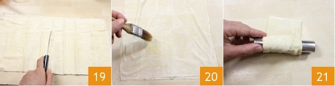 Now prepare the cannoli: unroll the phyllo dough and cut it in half 19, brush each sheet with melted butter 20 then overlap 3 sheets and cut them into three parts lengthwise and then in half widthwise, obtaining rectangles of about 2.75 x 4 inches. Roll each rectangle around the cannoli tube 21 ensuring the non-buttered side adheres to the tube (otherwise after baking they will not detach from the mold).