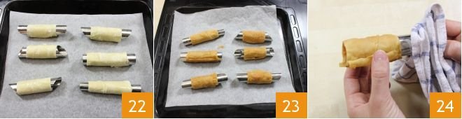 Place the cannoli on a baking sheet lined with parchment paper 22, brush the surface with butter, and bake in a static oven at 392°F for 18 minutes (or in a fan oven at 356°F for about 15 minutes). Once baked, remove the cannoli from the oven 23, gently remove the tube with a cloth, being careful not to burn yourself with the tube 24, and let them cool on a wire rack.