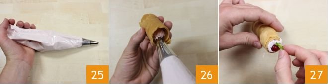 Transfer the now set cream into a piping bag 25 and fill the cannoli 26. Garnish with a currant berry and a mint leaf 27, dust the surface with powdered sugar and serve. Your phyllo dough cannoli with red fruit meringue are ready to be enjoyed!