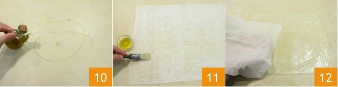 Oil the work surface 10, lay down the first sheet and oil it over the entire surface 11, lay down the second and do the same procedure as with the third sheet 12.
