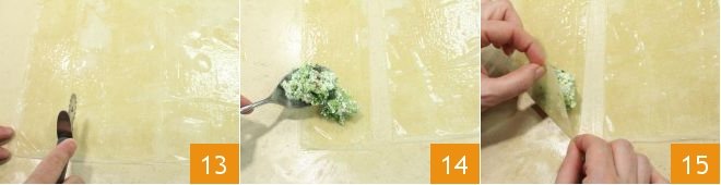 Now cut with a smooth pastry cutter wheel strips 3 inches wide 13, distribute the filling with a spoon at the base of the rectangle 14 and form the triangles: take the bottom left corner of the rectangle and fold it in half over the long side of the dough rectangle 15